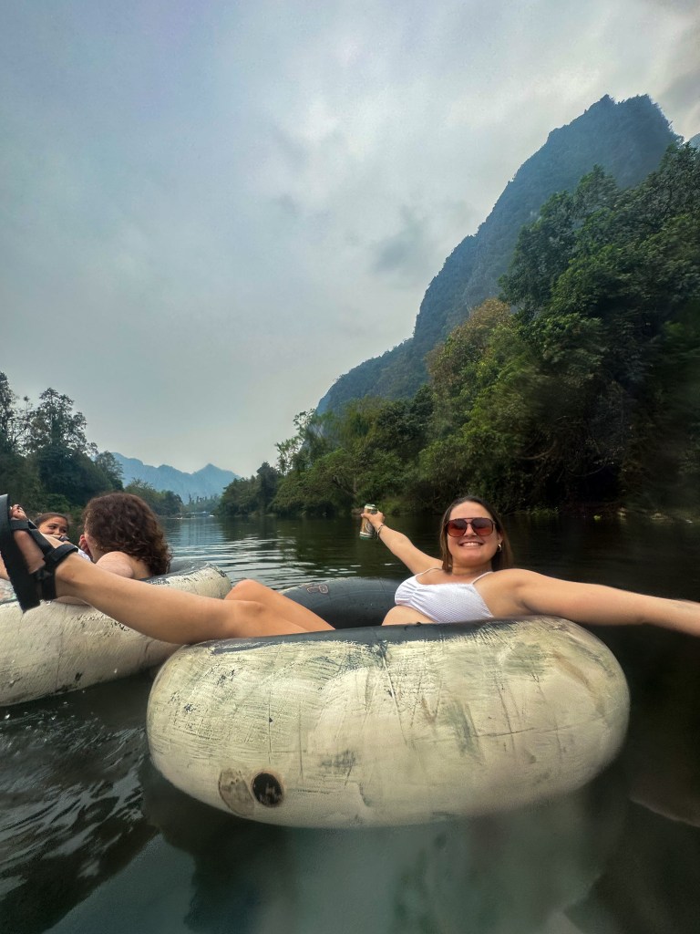 Our final day in Vang Vieng, we did their famous tipsy tubing. In classic Emily-Julia-Alec fashion, we chose the most overcast day to tube and instead of a large group ended up with an intimate tubing group of around 7 people (us + some Dutchies). But honestly, we still had a blast. I would recommend bringing or purchasing a dry bag to store your phones and clothes in and/or a waterproof phone case. I’ve heard too many horror stories of people losing phones while tipsy tubing here or in Pai. The tubing takes a few hours and there are 3 stops for drinks/food along the way. However, it’s a good idea to bring some beers or prepare a mixed drink beforehand (SE Asia has allowed me to revert to my high school ways and embrace the mixie in a water bottle).