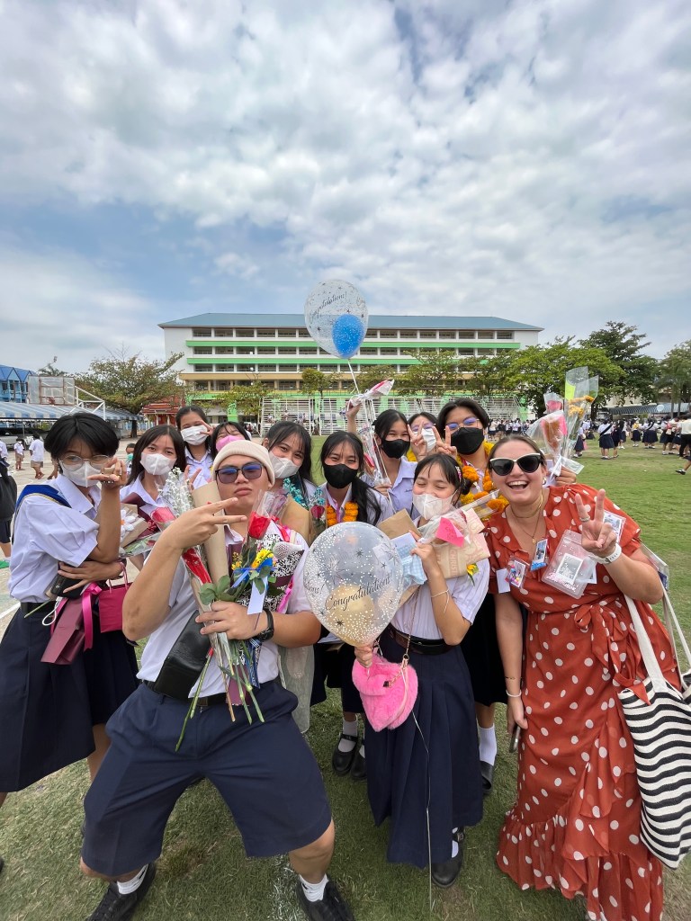 Despite these daily delights, I’d be remiss if I didn’t acknowledge the challenges of living in Thailand. For the past year, I’ve lived in an apartment building called Lucky Mansion that–according to Google Maps–is permanently closed. I flushed my toilet with a bucket. It rained in my bedroom whenever there was a heavy storm. I had a variety of dwellers living rent free–geckos who left their droppings everywhere, birds building nests in my window, and unwelcome bug invaders that I was forced to fend off. My landlord spoke not a word of English but would frequently tell me seemingly important information in rapid fire Thai. Being one of the only young foreigners in my town, I was frequently stared at and photographed while doing any normal activity. My students’ English levels varied greatly, and I had to create lesson plans that catered to both those who spoke fluently and those who would just smile at me when I asked them a question. I’m still recovering from the trauma of my recent leg infection that left me subject to the care of the staff at the local hospital who spoke barely any English. Yet, despite all these challenges, I wouldn’t trade a moment of this past year for anything. I realized early on that I had a choice in how I viewed these difficulties: I could get frustrated and upset (which wouldn’t change anything) or I could laugh and embrace the way nothing made sense. Naturally, I chose to laugh.